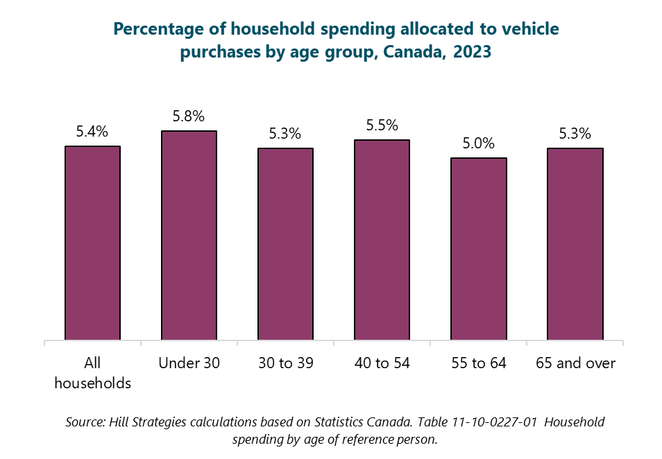The final context graph shows that, as a percentage of total household spending, vehicle purchases are highest among Canadians under 30 years of age, followed by those between 40 and 54 years of age.