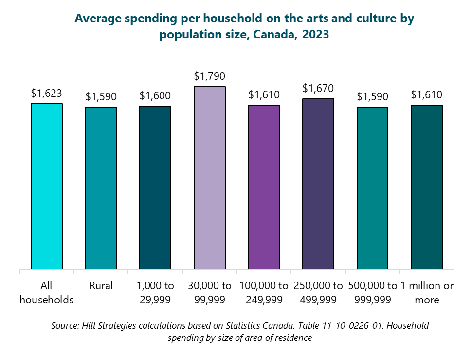 Average cultural spending is very close to the national average ($1,623 per household) in all but one population size group, the exception being residents of areas with populations between 30,000 and 99,999, who spend an above-average amount ($1,790).