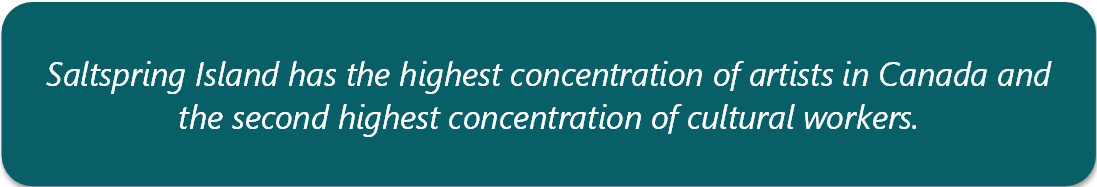 Saltspring Island Electoral Area has the second highest percentage of its labour force in cultural occupations out of all municipalities in Canada (10.7%, just one decimal point lower than Vancouver’s 10.8%). On Saltspring Island, there are 670 cultural workers among a labour force of 6,300 people. The 320 artists on Saltspring Island represent 5.1% of the local labour force, by far the highest concentration among Canadian municipalities and electoral areas with a population of at least 10,000. (West Vancouver is second, with 2.8%.) One in every 9 workers on Saltspring Island has a cultural occupation, and one in every 20 workers is an artist.