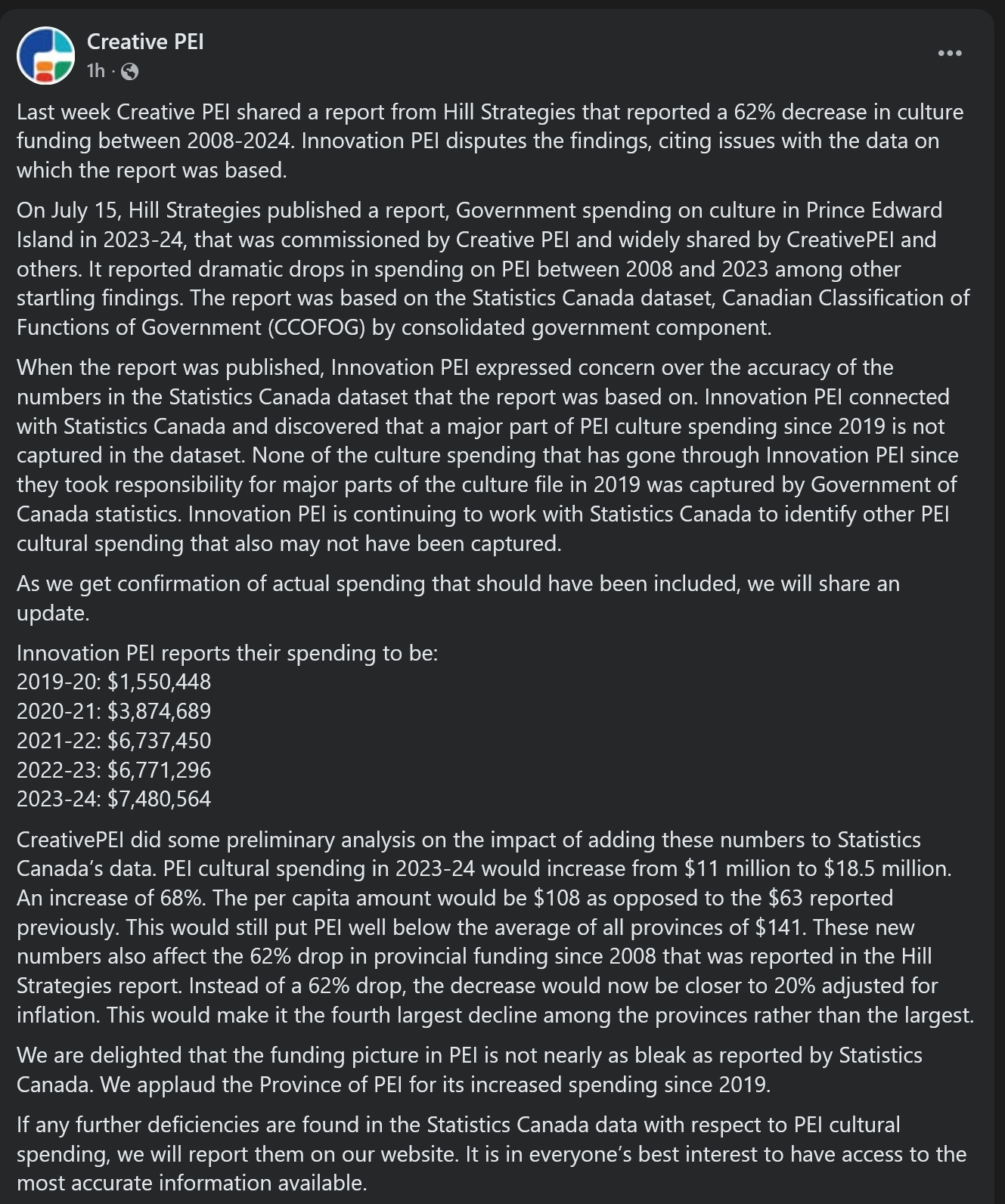 Hi Kelly, given the Innovation PEI revisions - what are the odds that similar problems existing Stats Can data for other smaller jurisdictions. I am using this report for some work in New Brunswick right now ... SI am also consulting CRA charitable listings and CADAC, with each having its own issues re: completeness and categorization of revenue/spending. Thanks.