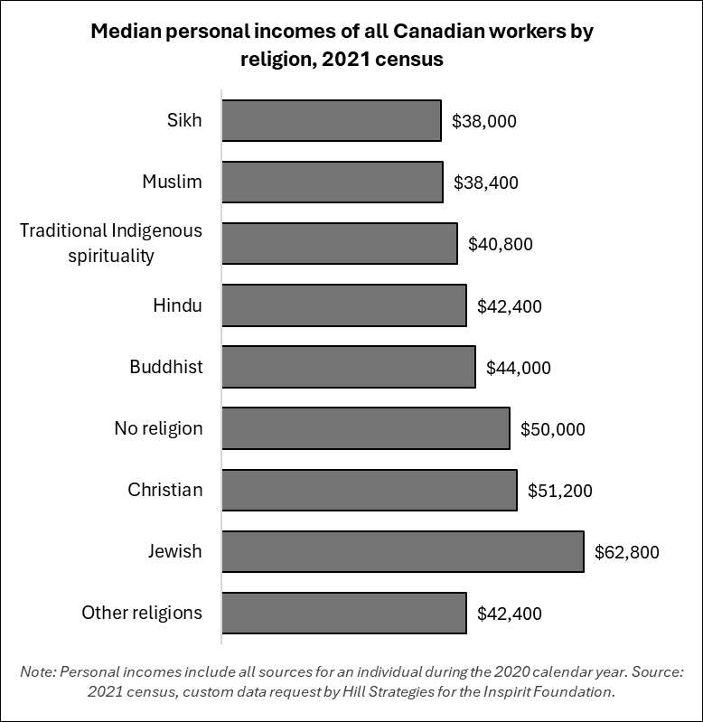 The following graph shows that, throughout the economy, Sikh and Muslim workers have the lowest median incomes ($38,000 and $38,400, respectively) among all groups of workers by religion. The median income of all Canadian workers is $49,600.