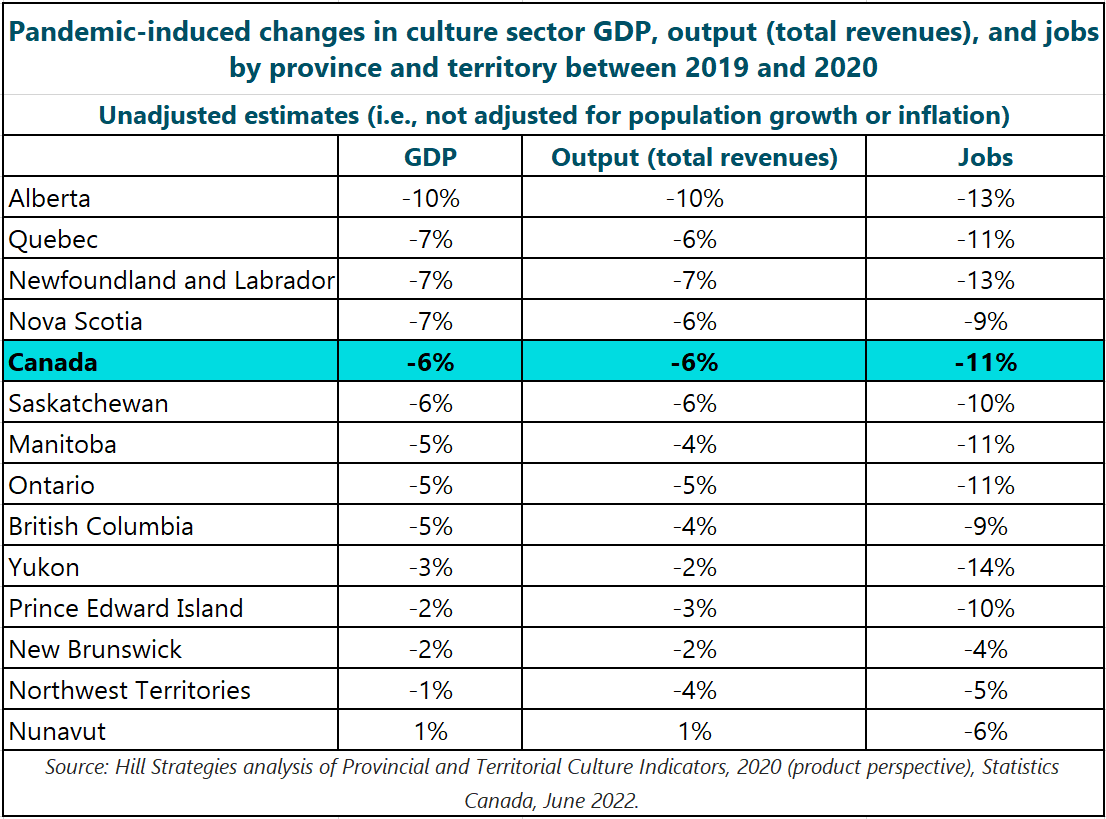 Between 2019 and 2020, Canada’s cultural economy shrunk by 6% (as measured by GDP), with an 11% decrease in cultural jobs. Did this vary across the country? How?